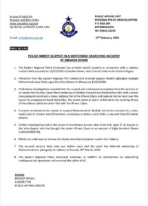 The lead suspect identified as Kwabla Egblorgbe Gadoglo Mohammed, alias Moha aged 31 was arrested at his hideout in Afienya on February February 13, 2026 while another suspect identified as Kwame Accolor alias Small Kidi, aged 37 was also arrested at Anyako in the Volta Region, for buying the stolen iPhone 13 pro at an amount of GHS 800.