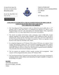 In another related case, the police has arrested two suspects on February 16th at about 1910 hours for attempting to bribe officers from the Regional CID office in Tema with GHS 150,000, in an attempt to unlawfully woe officers to release the truck and narcotics.